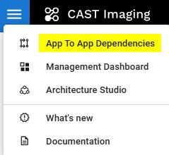 The App to App Dependencies view is accessed using the hamburger menu in the top left, when working in the Application landing page: