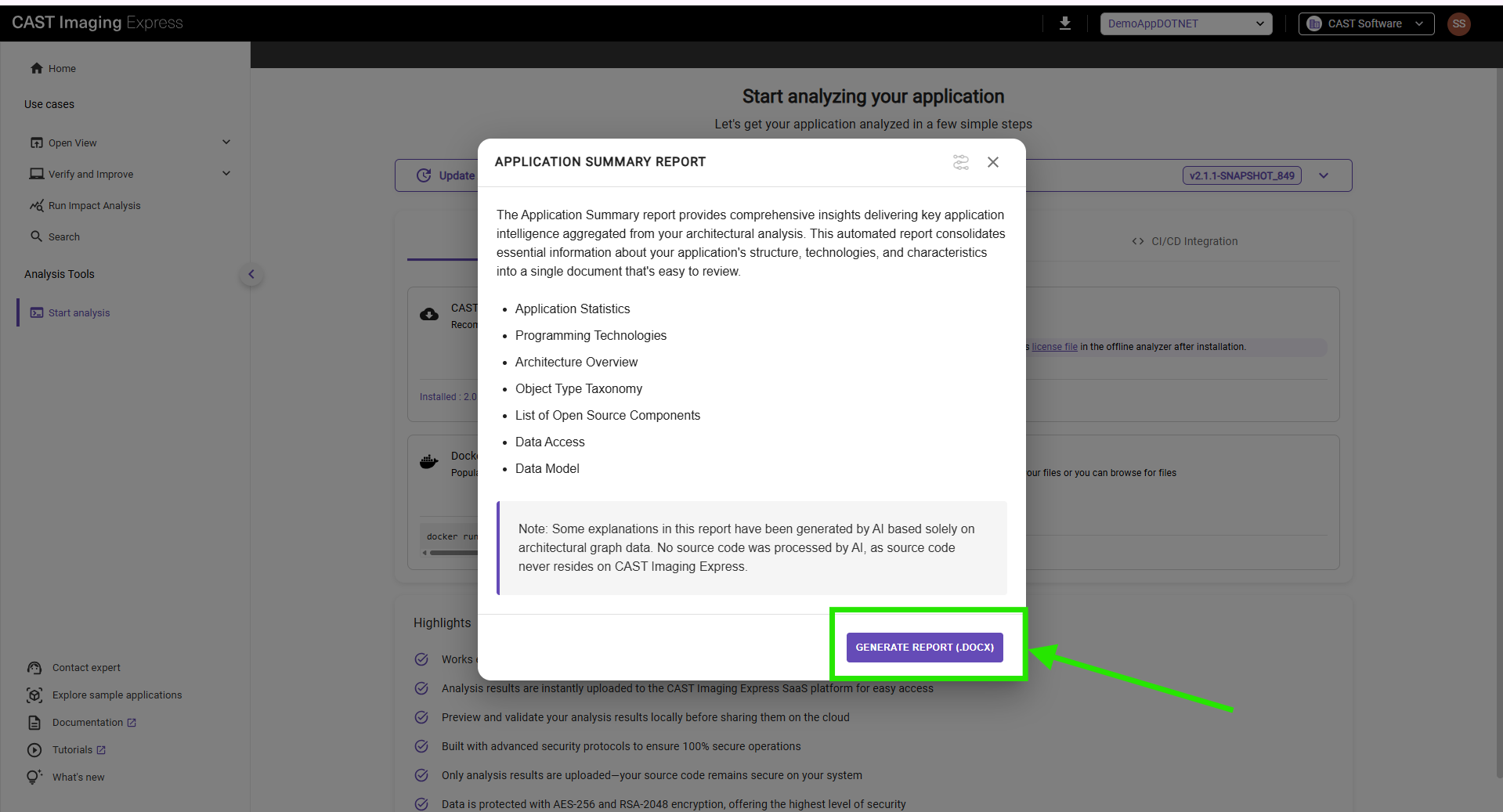 CAST Imaging Express uses AI to enhance the Application Summary Report generated after application analysis. This automated report consolidates essential information about your application’s structure, technologies, and characteristics into a single document that is easy to review.