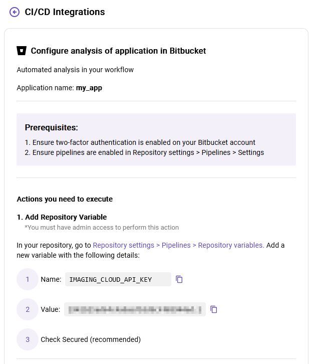 CAST Imaging Express requires that your application source code is stored in a Bitbucket repository (public or private) and that you have access to Bitbucket Pipelines in your Bitbucket account. Following that, a dedicated bitbucket-pipelines.yml file must be present at the root of your repository, containing instructions that will define when the Bitbucket Pipelines job is run, what it does and where the profiling and analysis results should be uploaded to.