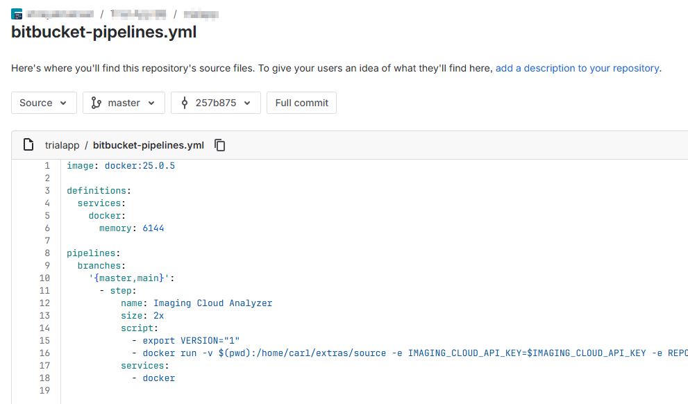 Create a bitbucket-pipelines.yml at the root of your repository in the “main” or “master” branch (i.e. the default). Paste in the code provided in CAST Imaging Express and commit your changes: