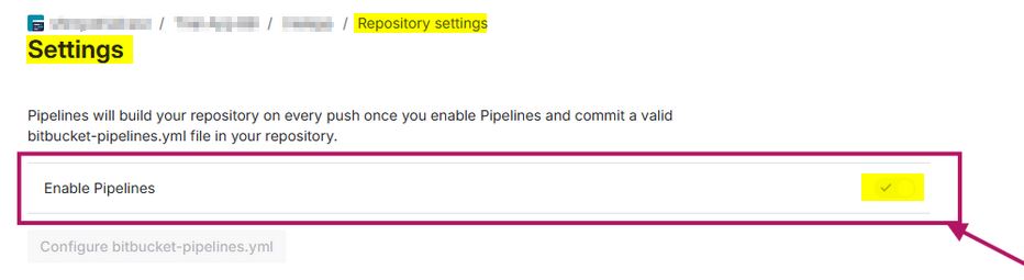- Ensure the Bitbucket Pipelines option is enabled in the repository via Repository settings > Pipelines > Settings: