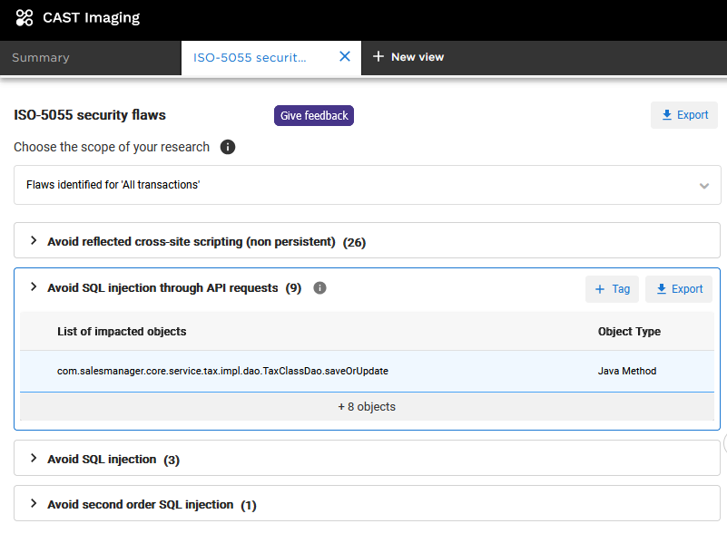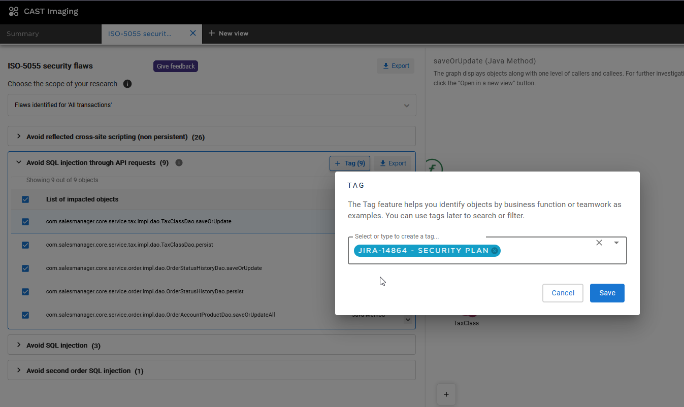 To facilitate remediation planning, CAST Imaging Express allows users to organize and track structural flaws using tags. The tagging feature enables teams to categorize violations based on business impact, priority, or ongoing initiatives. In the screenshot below, a security-related violation is tagged with a Jira ticket reference, linking the issue directly to an action plan. This capability helps development teams coordinate efforts efficiently, ensuring that critical flaws are addressed systematically.