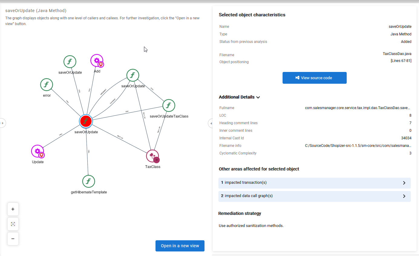- Detailed object characteristics, including metadata such as file location, complexity, and links to affected transactions or data call graphs