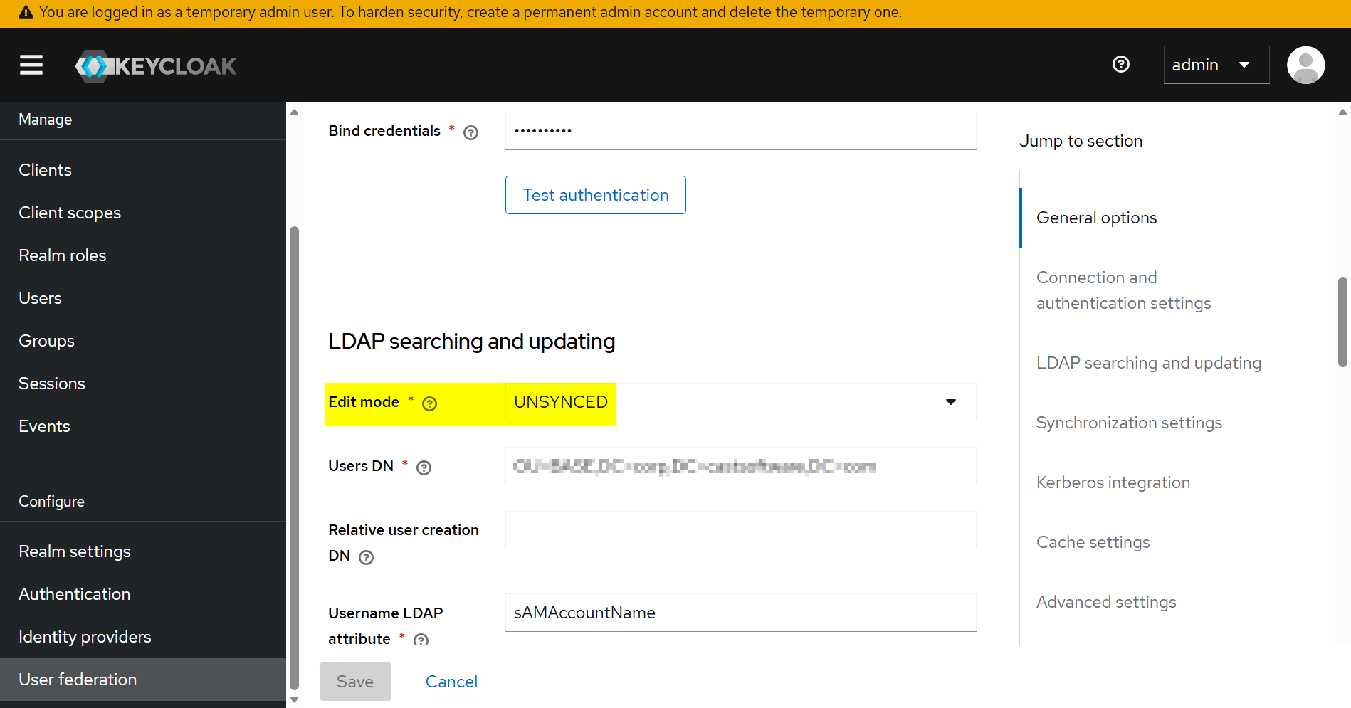 2. Set Edit mode to UNSYNCED in the LDAP User Federation settings