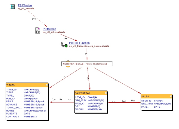 As an example, this image shows a transactional function to illustrate how the CAST estimation algorithm counts function points for it. The PowerBuilder window called w_gui_newsale is listed as language built-in user form and the CAST estimation algorithm runs a search automatically to identify the tables, data files etc. used. Here in the example, the engine finds 2 file type referenced (FTR):