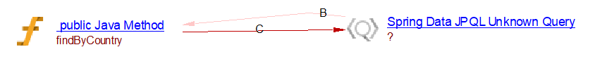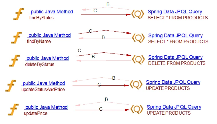 This spring data extension will create the links between objects that are created by the JEE analyzer (the JAVA Methods). For CRUD function calls and queries by inference links to entities handled by com.castsoftware.java.hibernate are created. In the case of database queries, if native queries or JDBC queries are invoked, Spring Data Query objects and respectively Spring JDBC Query objects are created and SQL Analyzer will handle the link to the table. In the case of the JPQL queries the extension creates Spring Data JPQL Query objects. The queries are registered for Java Persistence Framework and are handled by com.castsoftware.java.hibernate extension to create links to entity operations.