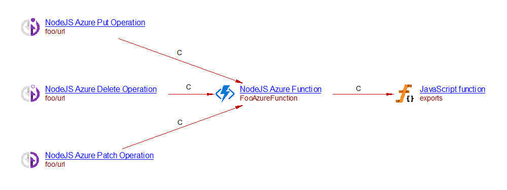 Whenever an Azure Function is found in the analyzed source code, an Azure Function object is created with a callLink to the JavaScript handler function. Note that if the handler function is defined in a TypeScript file, this extension will create the Azure Function with a callLink to the TypeScript handler function only if the com.castoftware.typescript extension is used.
