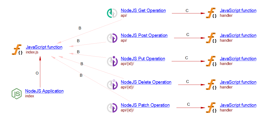 In this example, a NodeJS Application and five NodeJS operation objects are created. A relyOnLink is added between index application and index.js source code when ‘server’ API is found in index.js file. Five callLink are also created between the operations and handler functions corresponding.